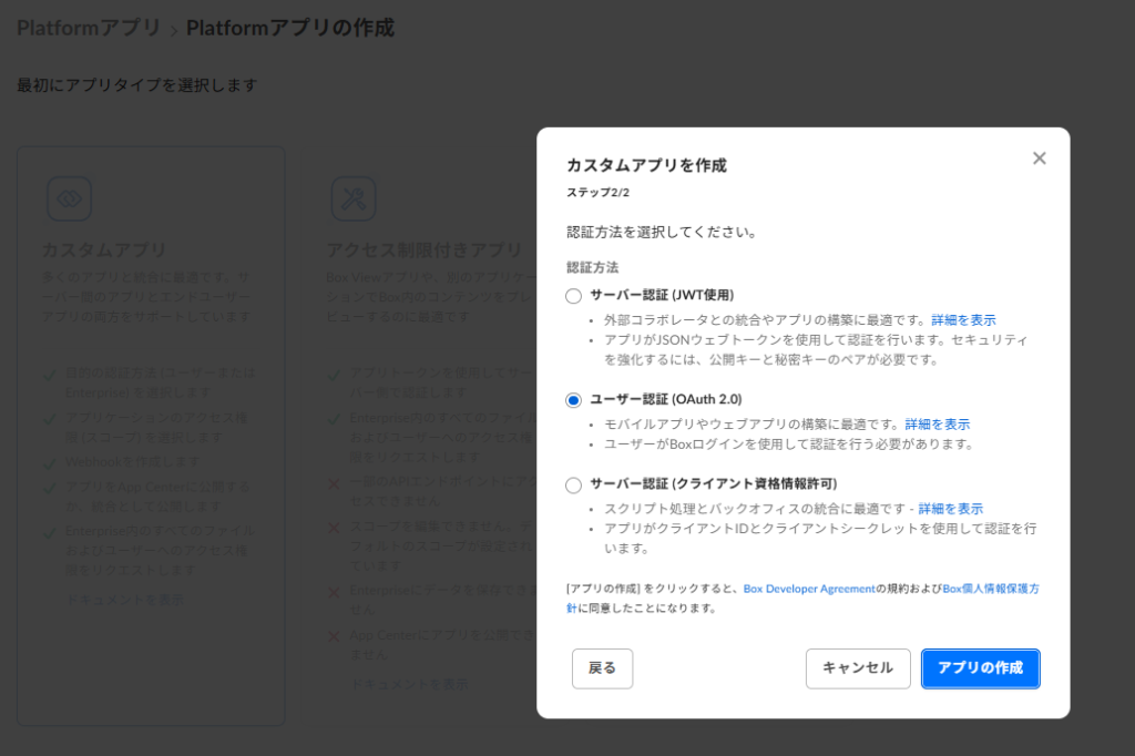 • OAuthクライアント作成の正確な手順については、本ページの情報は参考情報とし、公式ドキュメント(https://developer.box.com/)を参照すること