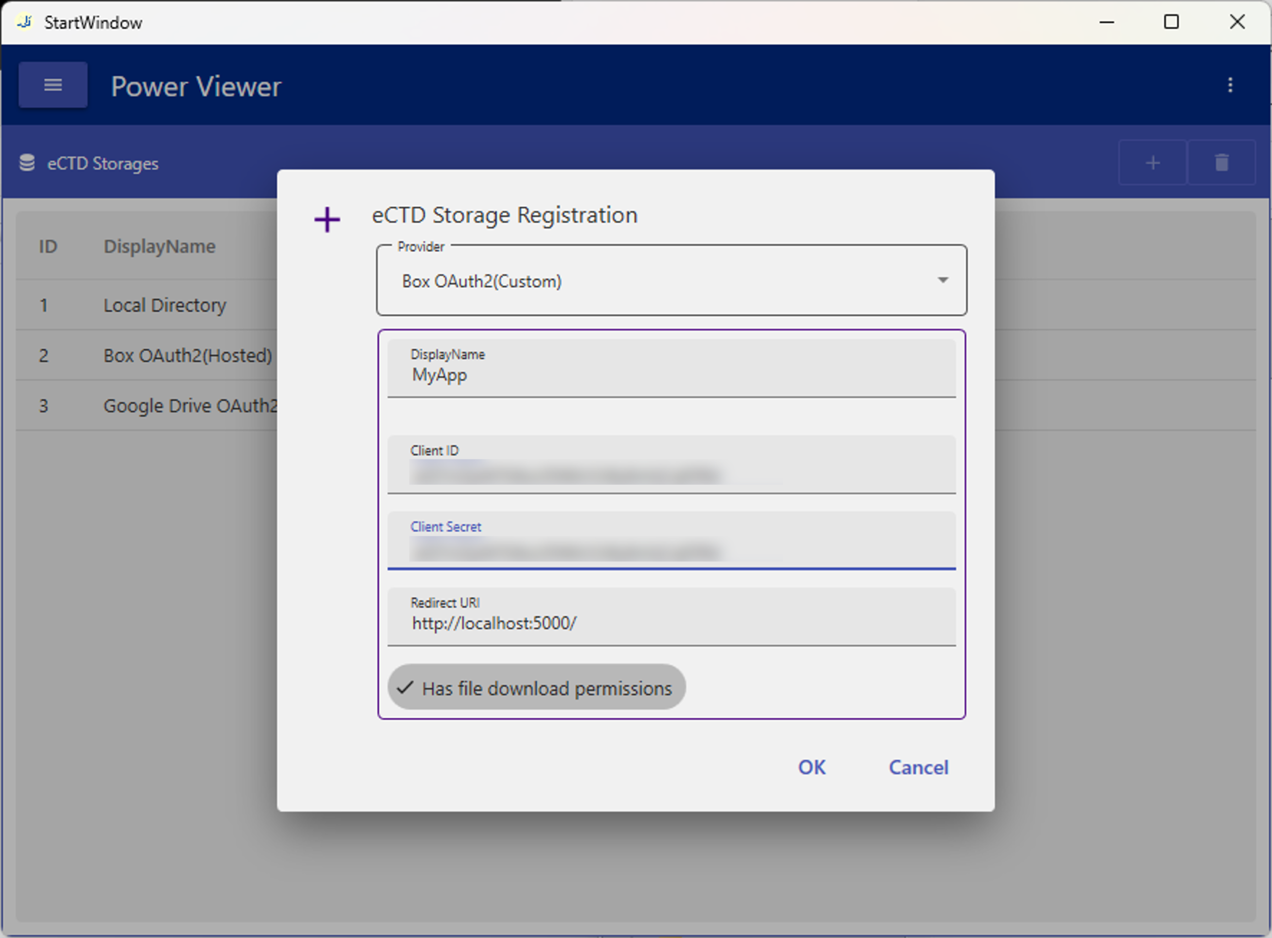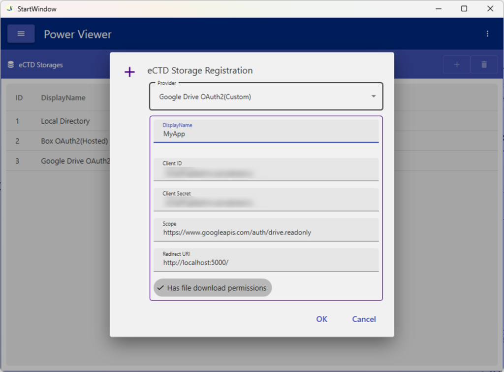 OAuthクライアントの情報を画面2に入力し、eCTD Storage設定を追加
