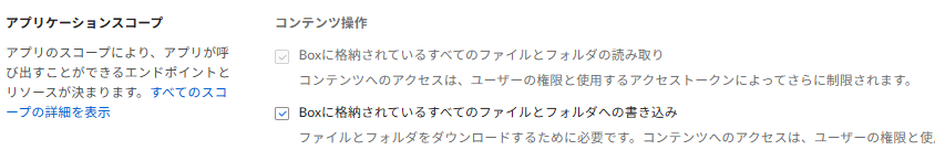「コンテンツ操作>Boxに格納されているすべてのファイルとフォルダへの書き込み」にチェック