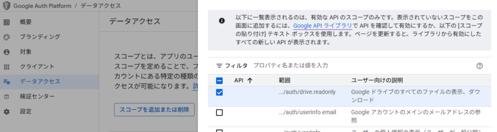 データアクセスタブで、以下のスコープを追加します。