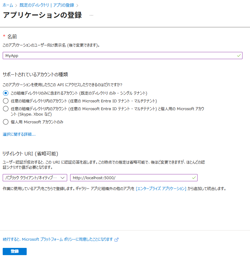 アプリ名、サポートされているアカウントの種類、リダイレクトURIを入力して、アプリを登録します。