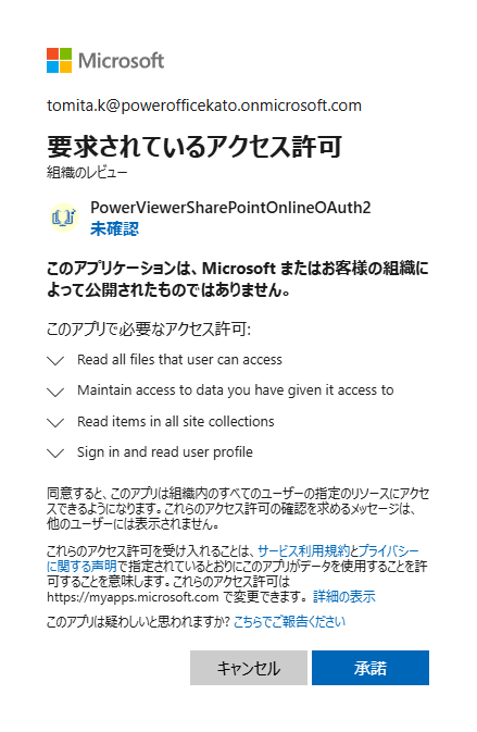 アプリPowerViewerSharePointOnlineOAuth2のテナントへのアクセス許可を承諾します。