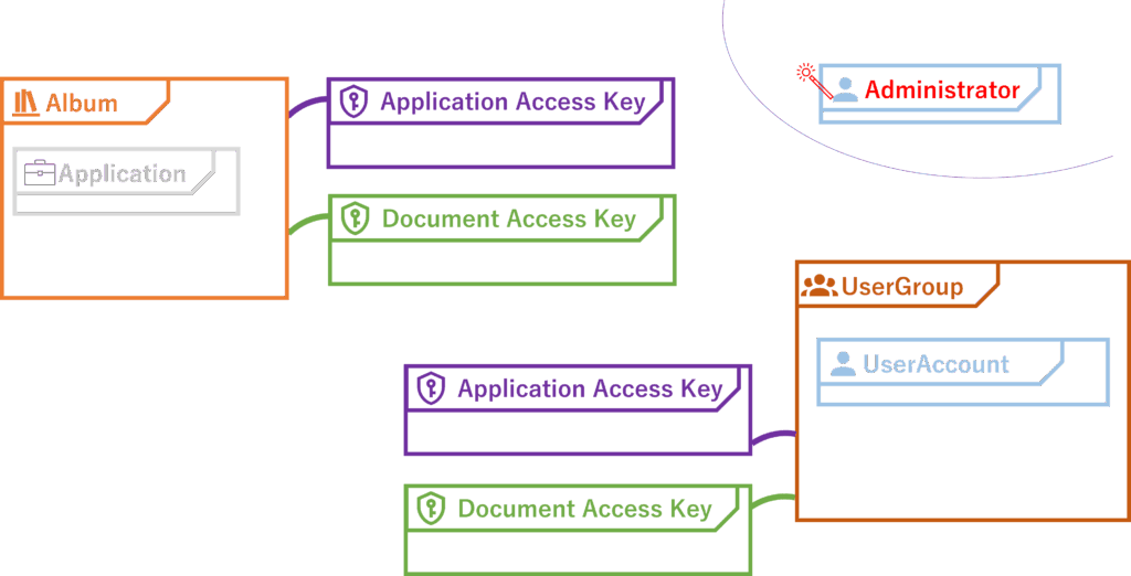 AlbumDatabaseへのアクセス権はAlbum, Application Access Key, Document Access Key, UserGroup, UserAccountによって制御されます。