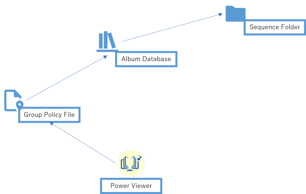グループポリシーファイル、アルバムデータベース、eCTD Storageの関係を簡単に図に示すと、以下のようになります。
